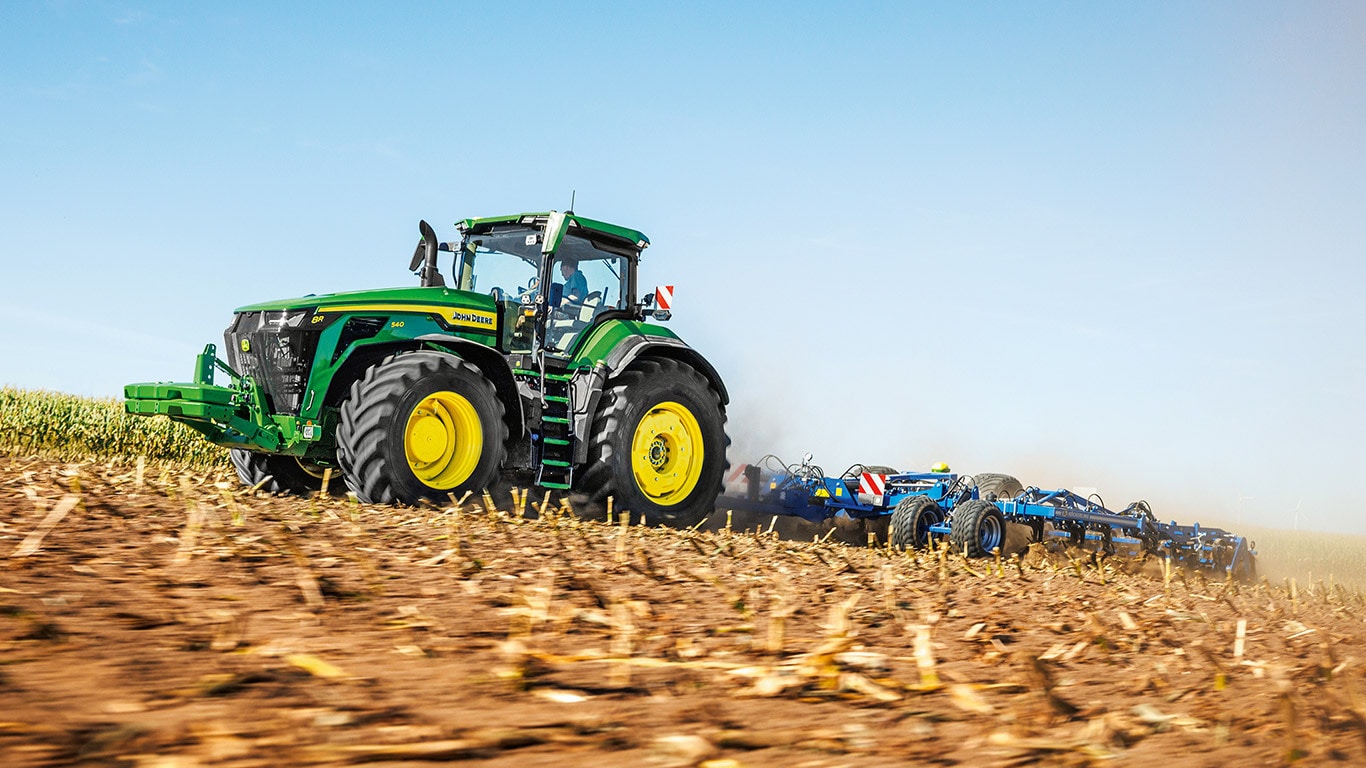 De nye 8R-traktorer med høj effekt leverer den trækkraft, du har brug for til de største redskaber. Med Peak Power IPM leverer JD14-motoren op til 634 hk præcist, når det er nødvendigt for at opnå optimal produktivitet under alle forhold. Den unikke eAutoPowr™ leverer trinløs acceleration og op til 8 % bedre effektoverførsel sammenlignet med hydromekaniske, trinløse standardtransmissioner*. De nye 8R med høj effekt har op til 2,30 m bagdæk, op til 1,85 m fordæk og et single-line, centralt dæktrykssystem til overlegen jordbeskyttelse, kraftoverførsel og alsidighed.